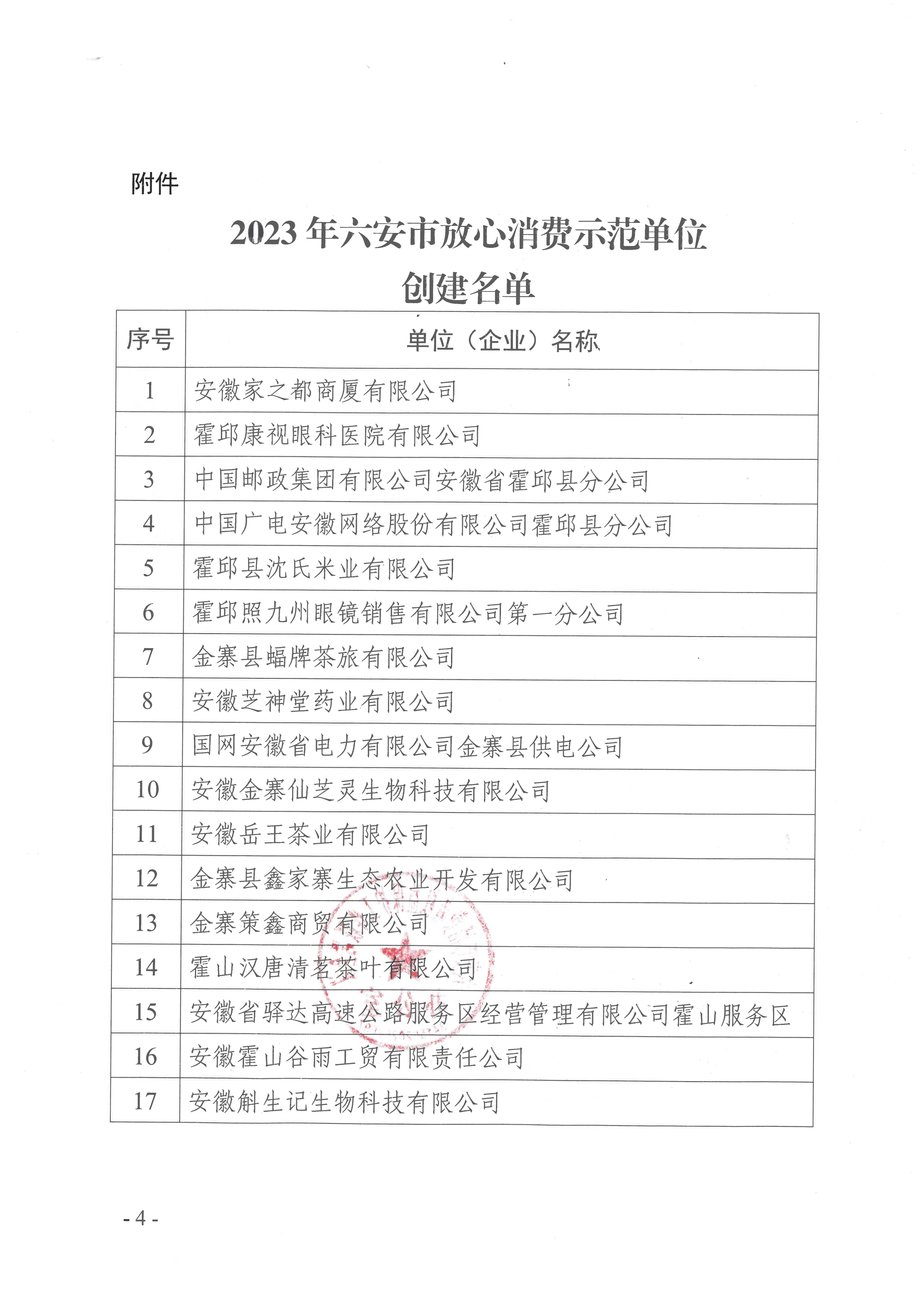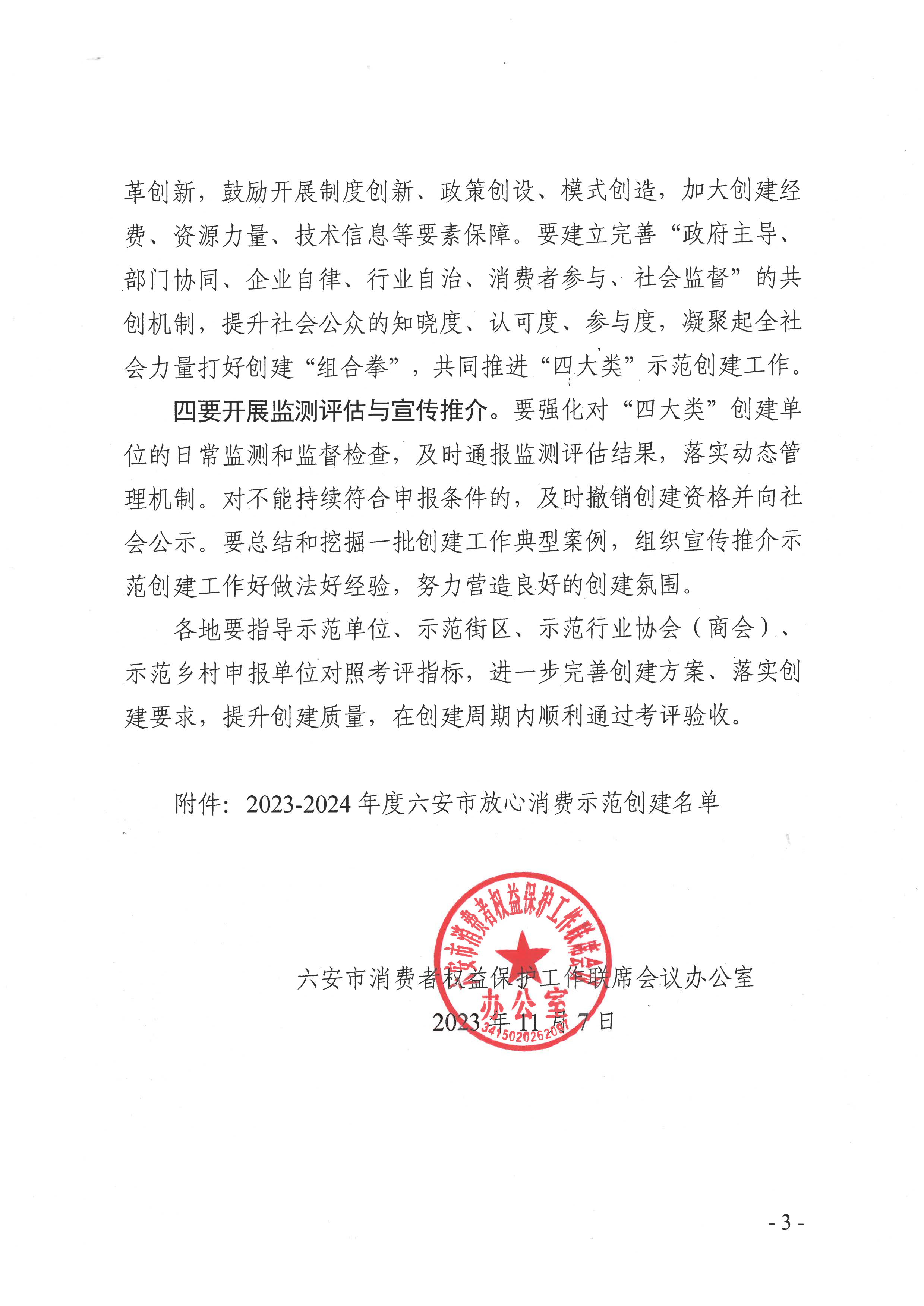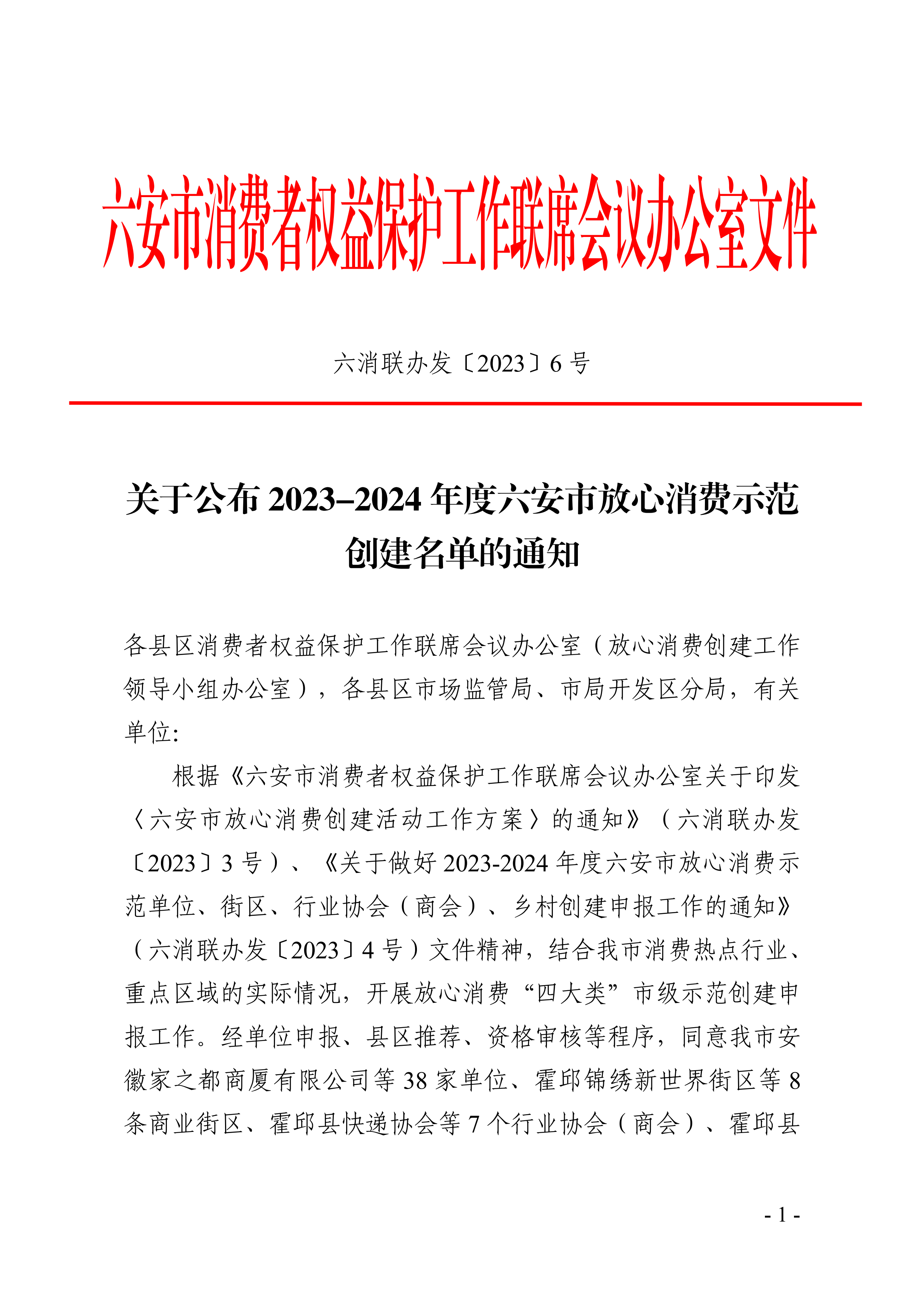 公司于2023年11月7日獲得六安市消費(fèi)者權(quán)益保護(hù)工作聯(lián)席會議評定為六安市放心消費(fèi)示范單位。